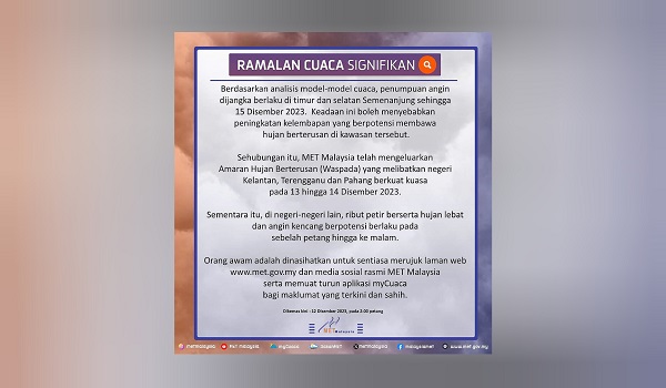 METMalaysia keluar ramalan cuaca signifikan sehingga esok