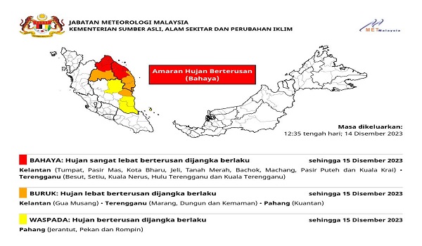 14/12/2023 | 2:04 pmNasionalMetMalaysia keluar amaran hujan berterusan tahap bahaya di Kelantan, Terengganu
