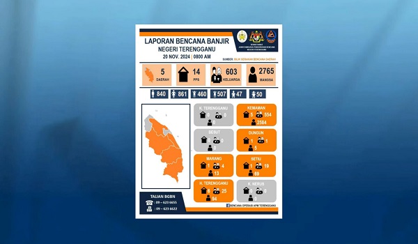 Banjir Terengganu: Penduduk terjejas cecah 2,765 orang pagi ini