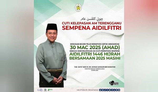Aidilfitri: Terengganu umum 30 Mac cuti peristiwa